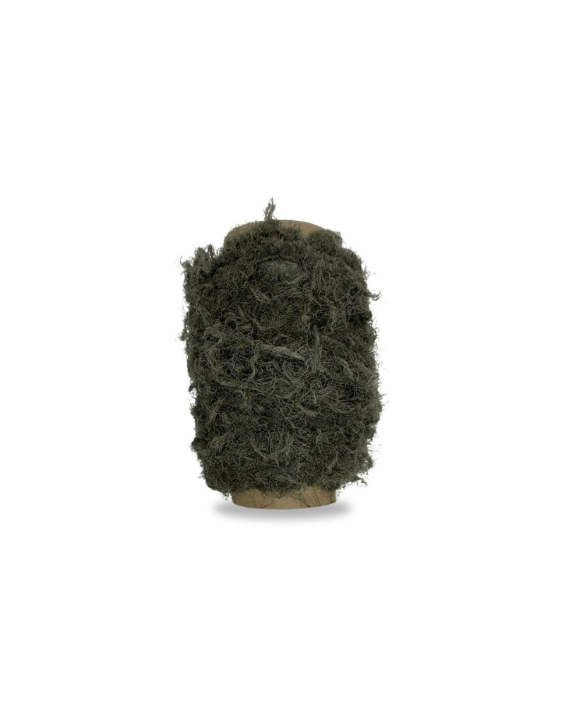Fio macio com aspecto pluma e desfiado, feito de seda natural e viscose reciclada. Ideal para criações autorais, arte têxtil e peças de impacto visual. Produto do bazar com preço especial.