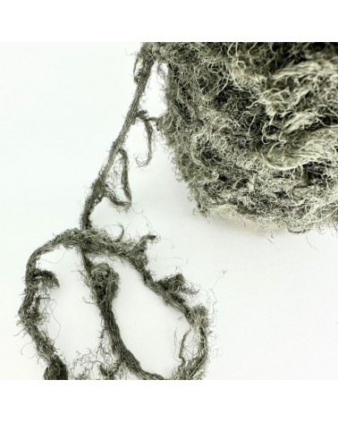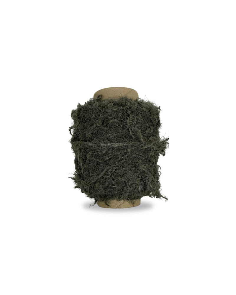 Fio macio com aspecto pluma e desfiado, feito de seda natural e viscose reciclada. Ideal para criações autorais, arte têxtil e peças de impacto visual. Produto do bazar com preço especial.