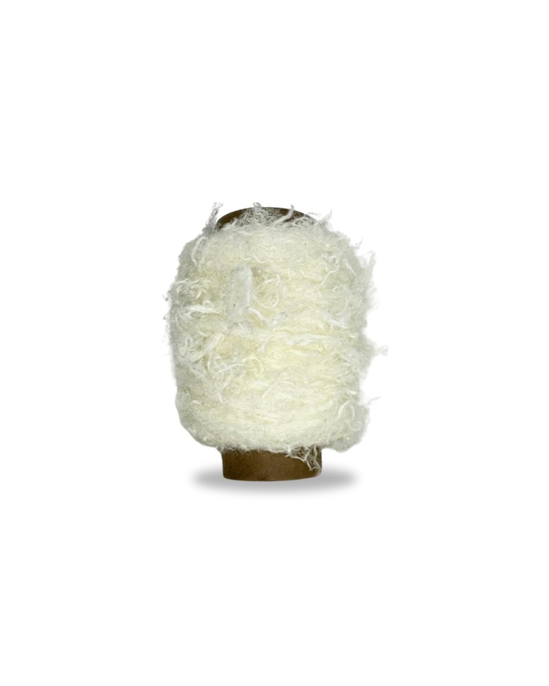 Fio macio com aspecto pluma e desfiado, feito de seda natural e viscose reciclada. Ideal para criações autorais, arte têxtil e peças de impacto visual. Produto do bazar com preço especial.