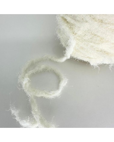 Fio macio com aspecto pluma e desfiado, feito de seda natural e viscose reciclada. Ideal para criações autorais, arte têxtil e peças de impacto visual. Produto do bazar com preço especial.