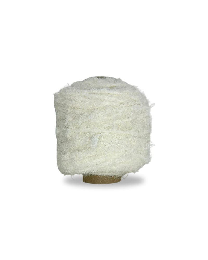 Fio macio com aspecto pluma e desfiado, feito de seda natural e viscose reciclada. Ideal para criações autorais, arte têxtil e peças de impacto visual. Produto do bazar com preço especial.