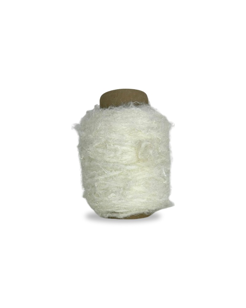 Fio macio com aspecto pluma e desfiado, feito de seda natural e viscose reciclada. Ideal para criações autorais, arte têxtil e peças de impacto visual. Produto do bazar com preço especial.