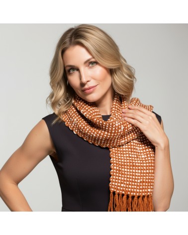 Cachecol estampado que apresenta uma maciez fantástica (Gensô significa fantástico em japonês), feito com fios 100% seda, especialmente produzidos para artigos de inverno. E também um cachecol 100% seda produzidos com fios artesanais, obtidos com a fiação de casulos de bicho-da-seda produzidos nas comunidades rurais de Nova Esperança. Os fios são tintos com corantes naturais tecidos pelas artesãs da Artisans Brasil em teares manuais.