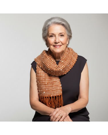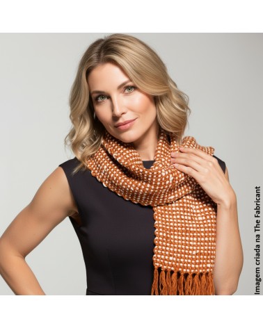 1 - Um Cachecol 100% seda produzido com fios artesanais, obtidos com a fiação de casulos de bicho-da-seda produzidos nas comunidades rurais de Nova Esperança. Os fios são tintos com corantes naturais tecidos pelas artesãs da Artisans Brasil em teares manuais.
