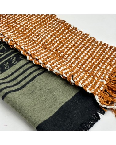 Kit Cachecol, seda que apresenta uma maciez fantástica (Gensô significa fantástico em japonês), feito com fios 100% seda, especialmente produzidos para artigos de inverno.